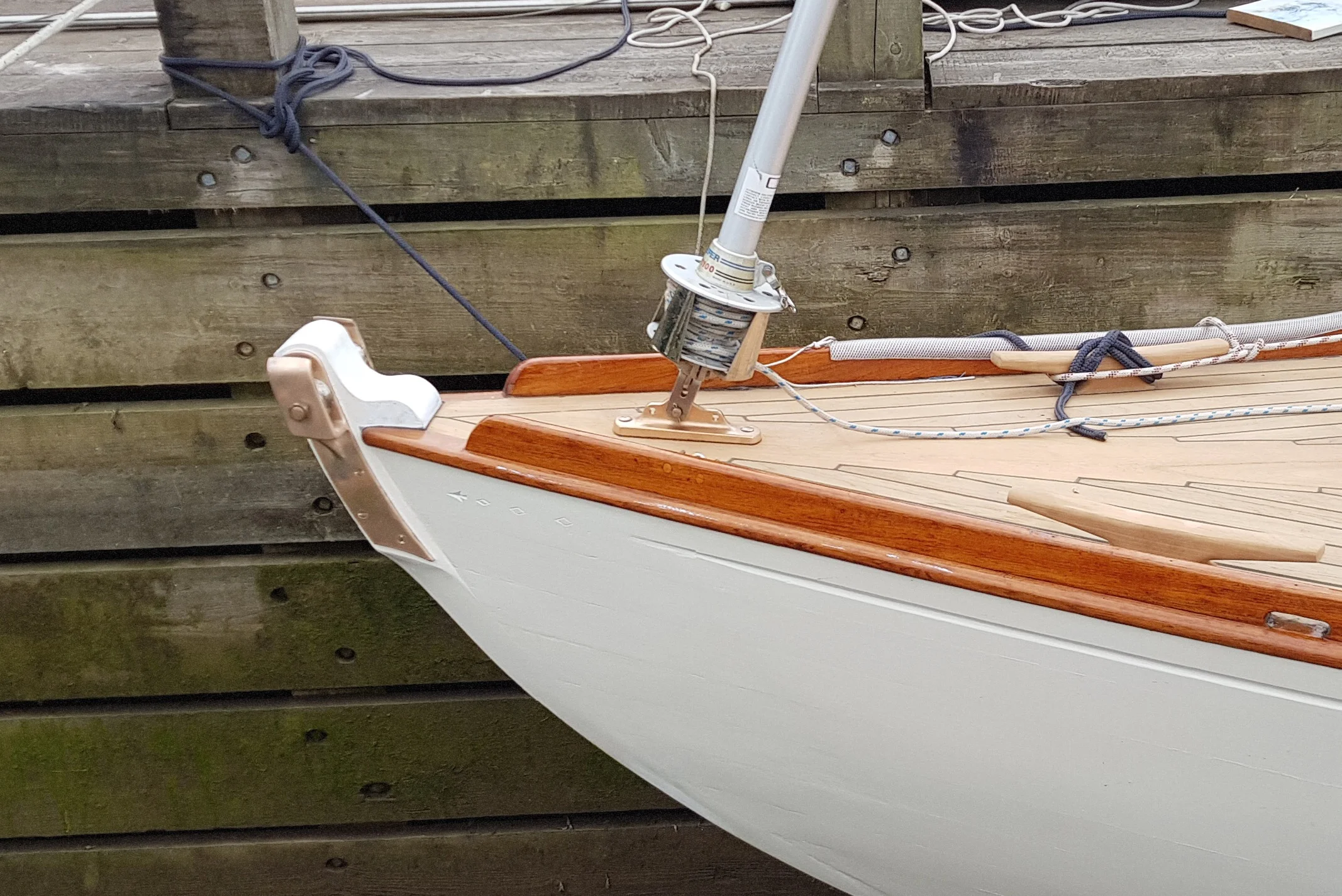 The work on Bandor has involved dropping and replacing the wood keel, she has now had two full frames replaced up forward, while the other original frames have been re-bedded into the new wood keel. Her deck has been re-caulked, a section of stem replaced; along with a new king plank and general repairs to the covering boards and beam shelves. We have also replaced the fabricated stainless steel fore-stay fitting with one cast in bronze, laid new wooden floors throughout and exchanged the Yanmar engine for a 25hp Beta engine. All in all the full works!