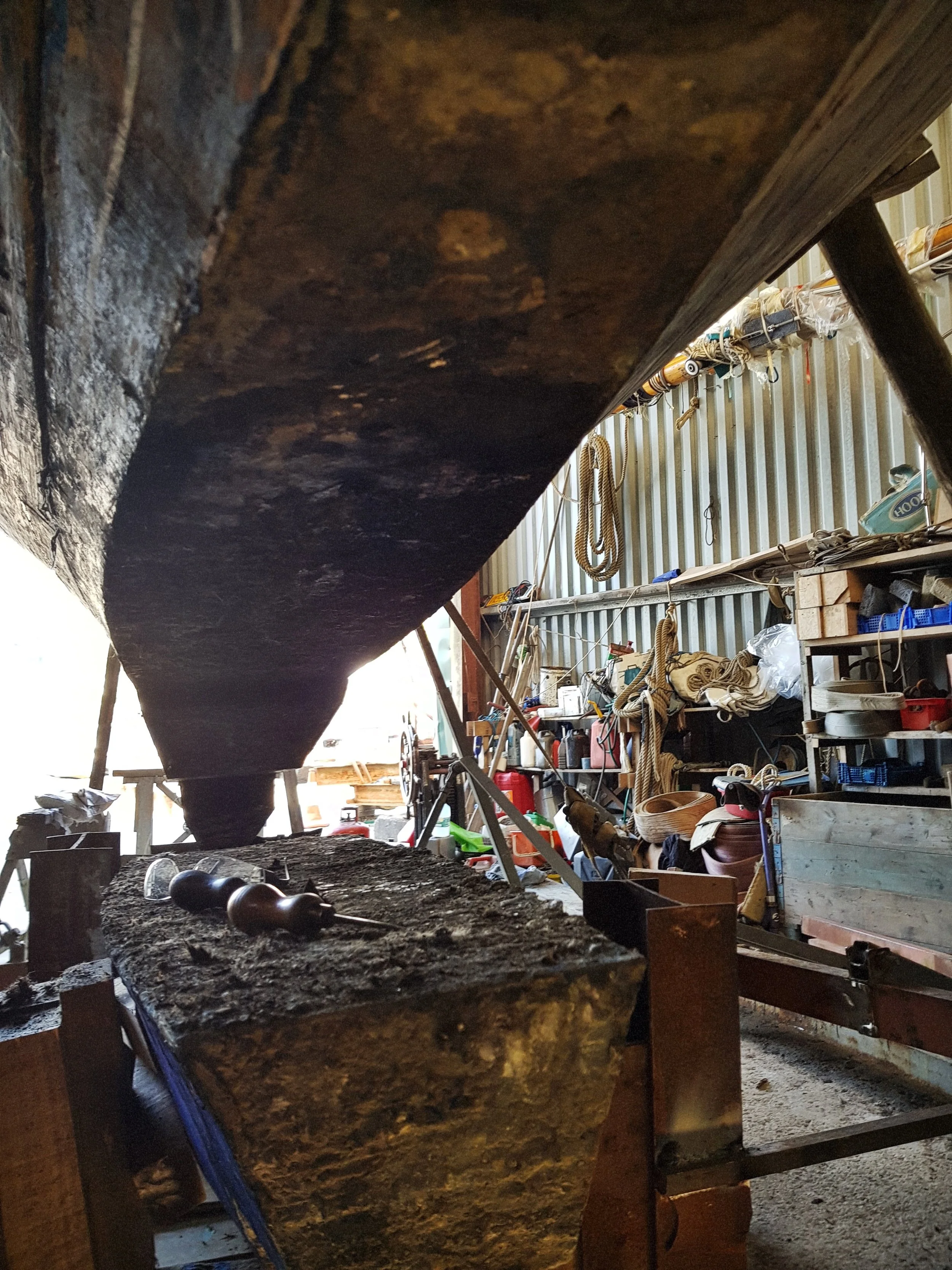 The delightful 37ft cruising yacht “Bandor” came to the yard initially for some investigative work and a deck re-caulk. However closer inspection revealed some serious degradation in and around a knot in the wooden keel under the mast step; the keel, particularly up forward was found not to be holding fastenings; and some degradation to the inside of the stem head at deck level.
